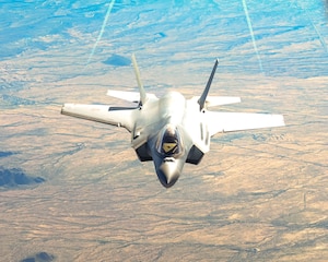 U.S. Air Force F-35A Lightning II’s assigned to the 56th Fighter Wing fly in a close formation in preparation for refueling, Dec. 2, 2025, over the skies of Arizona. The F-35A, equipped with advanced sensors, stealth technology, and superior aerodynamics, stands as the Air Force’s leading