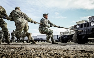 U.S. Air Force Senior Airman Caliya Cortner, 56th Civil Engineer Squadron engineering apprentice, strains alongside her team to pull a Humvee during the Prime Base Engineer Emergency Force readiness challenge, Nov. 20, 2025, at Luke Air Force Base, Arizona. This physically demanding exercise tests