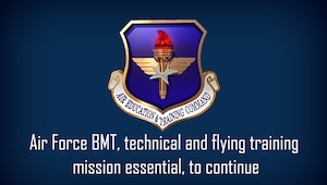 Staff Sgt. Tyler Michaud (left), 56th Equipment Maintenance Squadron aircraft structural maintenance, receives a temperature reading from Senior Airman Samantha Hulse, 56th Medical Group technician, before entering the medical group March 23, 2020, at Luke Air Force Base, Ariz. The 56th MDG is