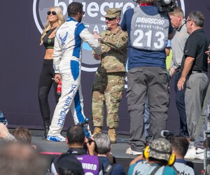 Air Force Chief of Staff Gen. David L. Goldfein shakes the hand of Darrell “Bubba” Wallace Jr., professional stock car driver, prior to the Bluegreen Vacations 500 NASCAR race Nov. 10, 2019, at the ISM Raceway in Avondale, Ariz. Wallace, sponsored by the U.S. Air Force, is a professional stock car