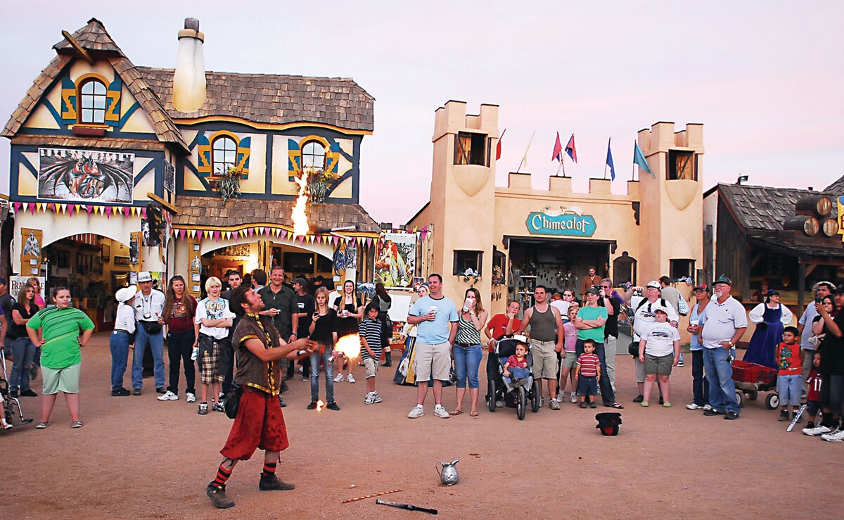 People stop to watch one of the many street performers juggle fire torches during the Arizona Renaissance Festival. The festival has acts including comedy, a falconer’s show, mud show and jousting. The festival is open Saturdays and Sundays through March 29 at 12601 East Highway 60, Apache Junction, Ariz. Outdoor recreation is hosting a trip to the festival March 21. Register by March 13 by calling (623) 856-9334. (U.S. Air Force photo/ C.J. Hatch.)