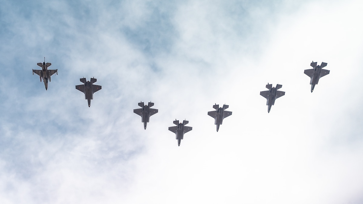A Republic of Singapore Air Force F-16D Fighting Falcon, left, a Belgian Air Component F-35A Lightning II, middle, and a U.S. Air Force F-35A Lightning II, right, aircraft assigned to the 56th Fighter Wing fly in formation, April 10, 2026, near Luke Air Force Base, Arizona. The integration of fourth and fifth-generation platforms demonstrates a lethal, credible deterrent, ensuring the U.S. and its allies maintain a competitive edge across the global landscape. The base generates combat-ready airpower by training F-35A pilots for the U.S. and partner nations, alongside continued F-16 training with the 425th Fighter Squadron to ensure a lethal, interoperable joint force. (U.S. Air Force photo by Senior Airman Belinda Guachun-Chichay)