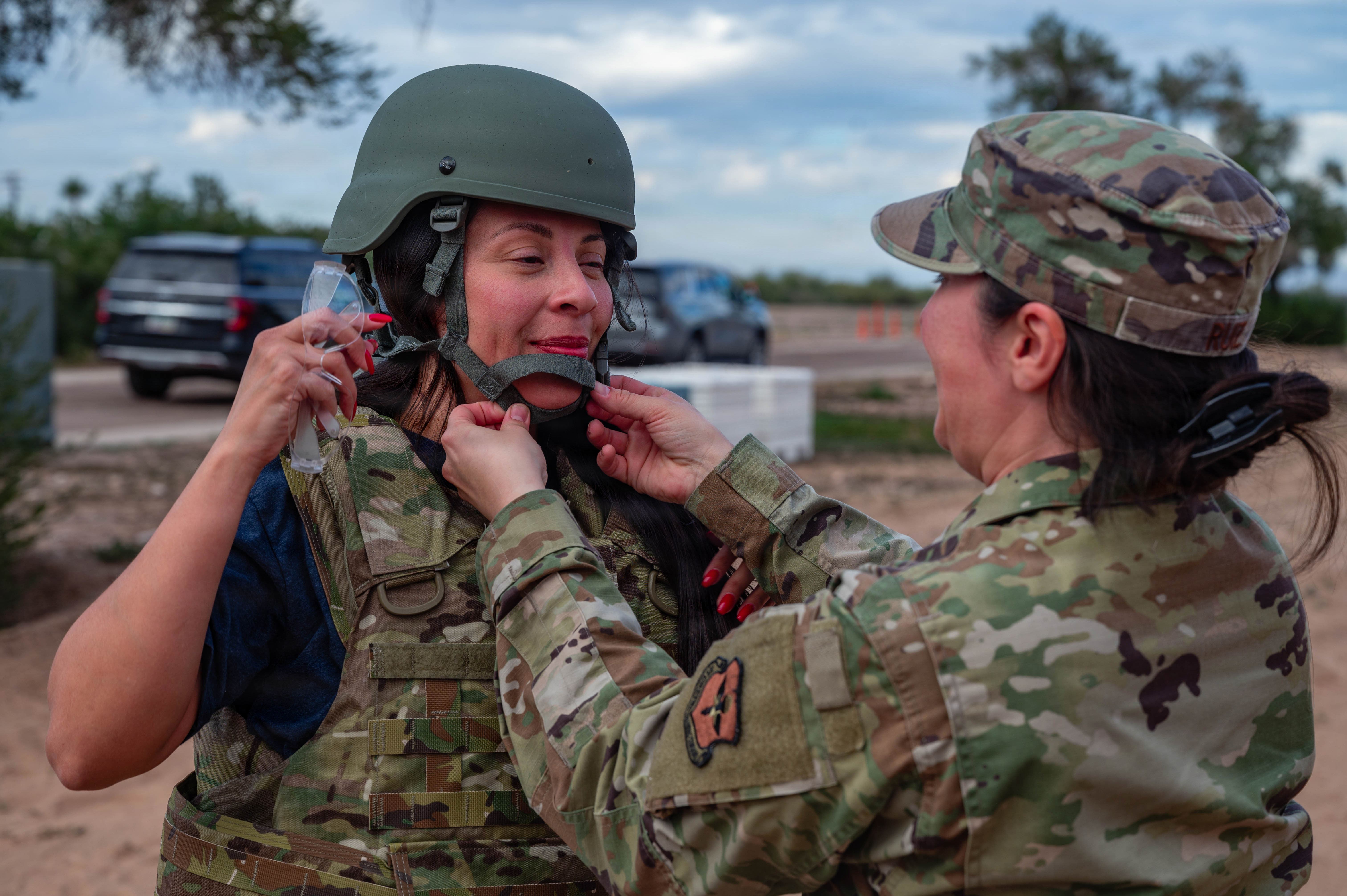 U.S. Air Force Master Sgt. Angela Ruiz, 56th Public Affairs chief of community relations, helps Elizabeth Canchola, 310th Fighter Squadron honorary commander, put on a helmet, Jan. 22, 2026, at Gila Bend Air Force Auxiliary Field, Arizona. HCCs took part in a simulated deployment, which replicated aspects of a deployed environment, allowing honorary commanders to experience the pace and structure of mission operations. Throughout the simulation, HCCs took part in briefings, operational activities, and direct engagement engaged directly with Airmen across the base. (U.S. Air Force photo by Airman 1st Class Tekorey Watkins)