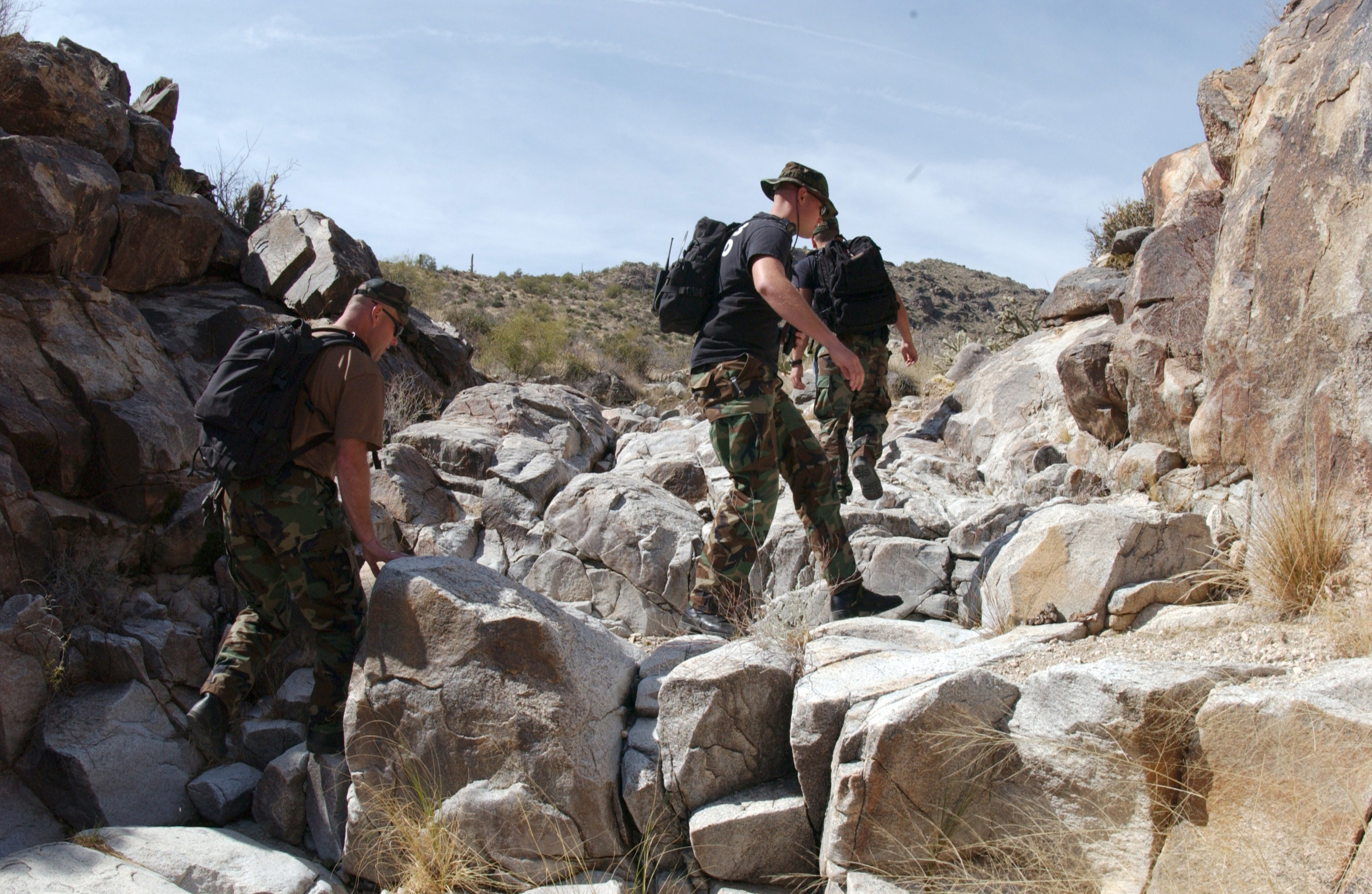 Airmen with the 56th Civil Engineer Squadron explosive ordnance disposal unit and the 56th Equipment Maintenance Squadron at Luke Air Force Base, Ariz., hike up the White Tank Mountains on Thursday, March 23, 2006. The group was going to the site of an F-16 Fighting Falcon triple ejector rack to ensure it didn't contain unexploded cartridges. The rack was released from a 61st Fighter Squadron F-16 during an in-flight emergency on Aug. 11, 2003. A local resident found the item while hiking and led the Air Force team to the site. (U.S. Air Force photo/Tech. Sgt. Angela Clemens)