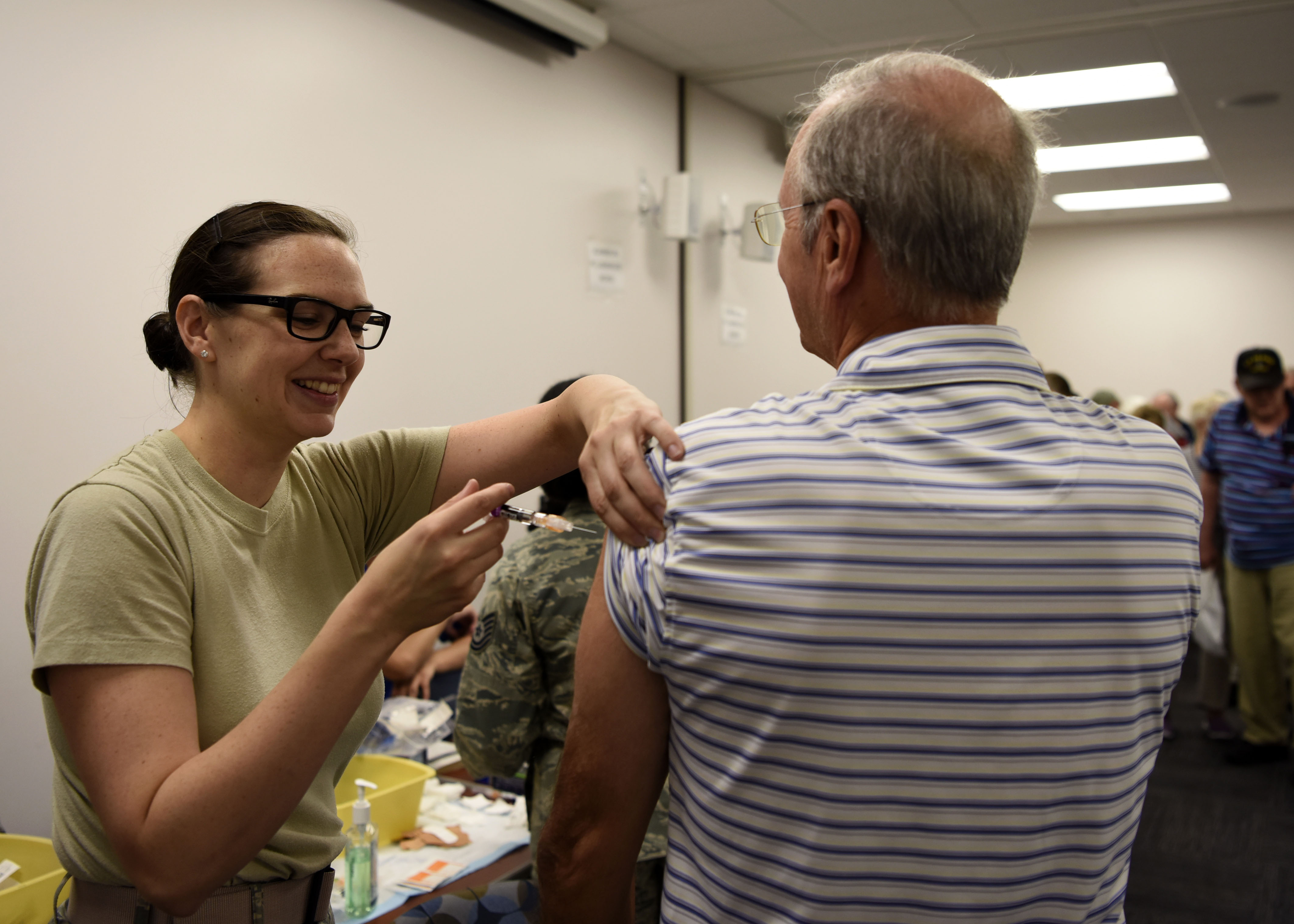 An Airman assigned to the 56th Medical Group administers a shot to a veteran during Retiree Appreciation Day event Oct. 20, 2018, at Luke Air Force Base, Ariz. 56th MDG members checked that the retirees were up to date on their shots and offered any they may have been missing. (U.S. Air Force photo by Airman 1st Class Zoie Rider)