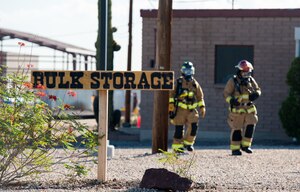 Oct. 11, 2019 Luke Airmen conduct a Fuel Spill Exercise Two 56th Civil Engineer Squadron firefighters walk through a fuel storage area during a fuel spill exercise Oct. 4, 2019, at Luke Air Force Base, Ariz. During the exercise, Luke emergency response teams responded to a simulated catastrophic fuel spill caused by extreme weather. Luke holds exercises
